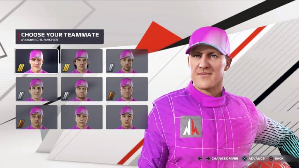 You’ll be able to select a teammate from the F1 2020 and 2021 grids too, but except for Mick Schumacher, Nikita Mazepin and Yuki Tsunoda – because, rather obviously, they are on the F1 grid already.